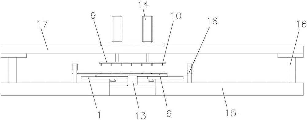 所述底座15上通過(guò)支架16固定安裝一條橫梁17,橫梁17上固定安裝升降氣缸14,升降氣缸14的伸出端與如圖7所示的壓板9固定連接,壓板9位于導(dǎo)向板6的正上方,所述壓板9上固定安裝有若干與石墨舟18上的工藝孔相對(duì)應(yīng)的壓桿10,所述壓桿10與所述導(dǎo)向套筒8同軸心。